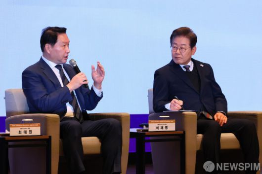 [서울=뉴스핌] 국회사진취재단 = 최태원 대한상공회의소 회장이 8일 오전 서울 중구 대한상공회의소에서 열린 이재명 후보 초청 경제5단체 간담회에서 정책 제언을 하고 있다. 2025.05.08 2025.05.08 photo@newspim.com