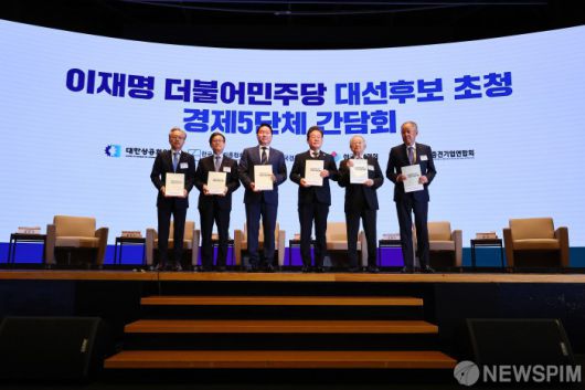 [서울=뉴스핌] 국회사진취재단 = 이재명 더불어민주당 대선 후보가 8일 오전 서울 중구 대한상공회의소에서 열린 이재명 후보 초청 경제5단체 간담회에서 경제5단체장들에게 정책 제언집을 전달 받은 뒤 기념촬영을 하고 있다. 왼쪽부터 최진식 한국중견기업연합회장, 윤진식 한국무역협회장, 최태원 대한상공회의소 회장, 이 후보, 손경식 한국경영자총협회장, 류진 한국경제인협회장. 2025.05.08 photo@newspim.com