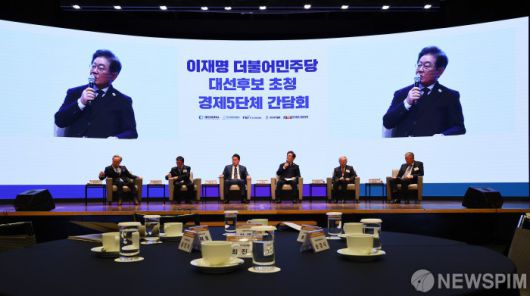 [서울=뉴스핌] 국회사진취재단 = 이재명 더불어민주당 대선 후보가 8일 오전 서울 중구 대한상공회의소에서 열린 이재명 후보 초청 경제5단체 간담회에서 발언하고 있다. 2025.05.08 2025.05.08 photo@newspim.com