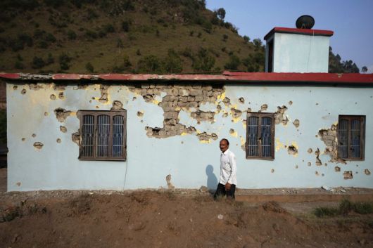 지난 7일 수요일, 인도 라조우리(Rajouri)에서 한 남성이 파키스탄의 포격으로 손상된 건물 옆을 지나가고 있다. 뉴시스 외신화상 |
