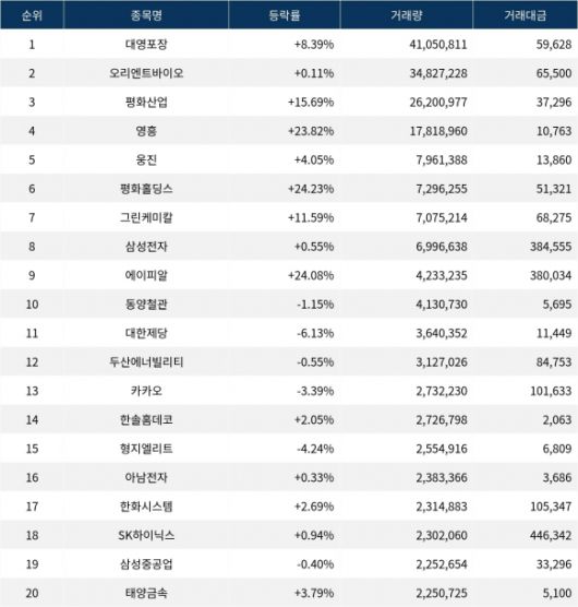평화산업(090080)은 26,200,977주의 거래량으로 3위를 기록하며, 현재가 1,438원에서 15.69%의 급등세를 보인다. 거래대금은 37,296백만원으로 시가총액의 4.73%에 해당한다. 영흥(012160)은 17,818,960주의 거래량과 함께 23.82%의 폭등세를 기록 중이며, 웅진(016880)은 7,961,388주의 거래량과 4.05% 상승세를 보인다. 그린케미칼(083420)은 7,075,214주의 거래량과 11.59%의 급등세를 기록하고 있다. r