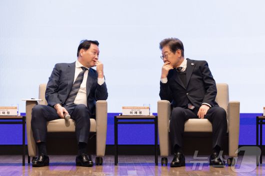 (서울=뉴스1) 국회사진취재단 = 이재명 더불어민주당 대선후보가 8일 오전 서울 중구 대한상공회의소에서 열린 대선후보 초청 경제5단체장 간담회에서 최태원 대한상의 회장과 대화하고 있다. 2025.5.8/뉴스1photo@news1.krCopyright ⓒ 뉴스1. All rights reserved. 무단 전재 및 재배포, AI학습 이용 금지.