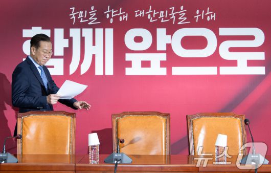 (서울=뉴스1) 이재명 기자 = 권영세 국민의힘 비상대책위원장이 8일 오후 서울 여의도 국회에서 단일화 관련 기자간담회에 참석하고 있다. 2025.5.8/뉴스1