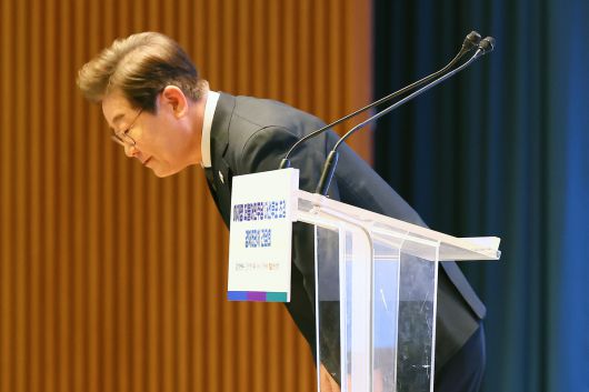 이재명 더불어민주당 대선후보가 8일 서울 중구 대한상공회의소에서 열린 대선후보 초청 경제5단체장 간담회에서 발언을 마치고 인사하고 있다. 국회사진기자단 |