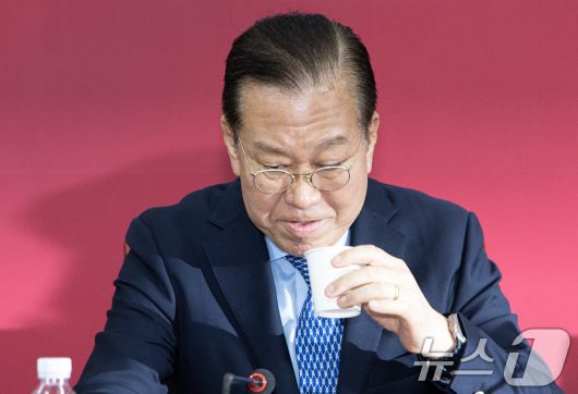 (서울=뉴스1) 이재명 기자 = 권영세 국민의힘 비상대책위원장이 8일 오후 서울 여의도 국회에서 단일화 관련 기자간담회에 앞서 물을 마시고 있다. 2025.5.8/뉴스1