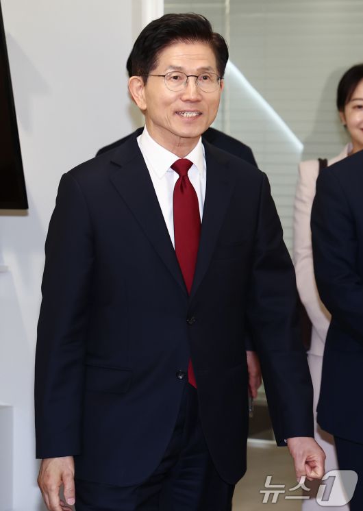(서울=뉴스1) 김민지 기자 = 김문수 국민의힘 대통령 후보가 8일 오후 서울 여의도 중앙당사에 마련된 후보실에서 업무를 보기 위해 들어오고 있다. 2025.5.8/뉴스1