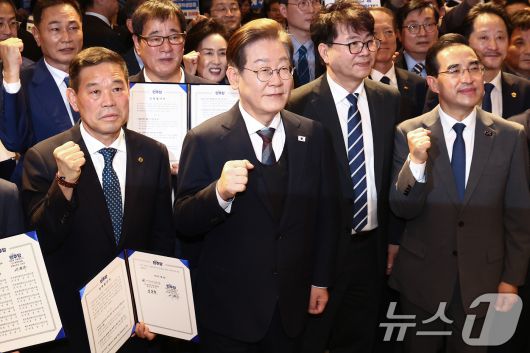 (서울=뉴스1) 김민지 기자 = 이재명 더불어민주당 대통령 후보가 8일 오후 서울 영등포구 중소기업중앙회에서 열린 중앙선거대책위원회 직능본부 민생정책 협약식에서 참석자들과 기념 촬영을 하고 있다. 2025.5.8/뉴스1kimkim@news1.krCopyright ⓒ 뉴스1. All rights reserved. 무단 전재 및 재배포, AI학습 이용 금지.