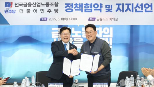 [서울=뉴스핌] 김학선 기자 = 박찬대 더불어민주당 상임총괄선거대책위원장과 김형선 금융노조 위원장이 8일 서울 중구 전국금융산업노동조합 사무실에서 열린 더불어민주당-금융노조 지지선언 및 정책협약식에서 협약서에 서명 후 악수하고 있다. 2025.05.08 yooksa@newspim.com