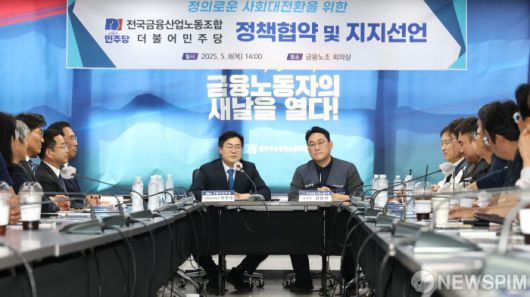 [서울=뉴스핌] 김학선 기자 = 박찬대 더불어민주당 상임총괄선거대책위원장이 8일 서울 중구 전국금융산업노동조합 사무실에서 열린 더불어민주당-금융노조 지지선언 및 정책협약식에서 인사말을 하고 있다. 2025.05.08 yooksa@newspim.com