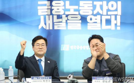 [서울=뉴스핌] 김학선 기자 = 박찬대 더불어민주당 상임총괄선거대책위원장(왼쪽)이 8일 서울 중구 전국금융산업노동조합 사무실에서 열린 더불어민주당-금융노조 지지선언 및 정책협약식에서 주먹을 불끈 쥐고 있다. 오른쪽은 김형선 금융노조 위원장. 2025.05.08 yooksa@newspim.com