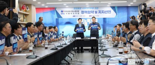 [서울=뉴스핌] 김학선 기자 = 박찬대 더불어민주당 상임총괄선거대책위원장과 김형선 금융노조 위원장이 8일 서울 중구 전국금융산업노동조합 사무실에서 열린 더불어민주당-금융노조 지지선언 및 정책협약식에서 참석자들과 함께 구호를 외치며 이재명 후보 지지를 선언하고 있다. 2025.05.08 yooksa@newspim.com
