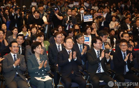 [서울=뉴스핌] 최지환 기자 = 이재명 더불어민주당 대선후보가 8일 오후 서울 영등포구 중소기업중앙회에서 열린 더불어민주당 중앙선거대책위원회 직능본부 민생정책 협약식에 자리해 있다. 2025.05.08 choipix16@newspim.com