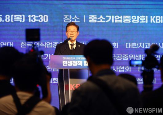 [서울=뉴스핌] 최지환 기자 = 이재명 더불어민주당 대선후보가 8일 오후 서울 영등포구 중소기업중앙회에서 열린 더불어민주당 중앙선거대책위원회 직능본부 민생정책 협약식에서 발언하고 있다. 2025.05.08 choipix16@newspim.com