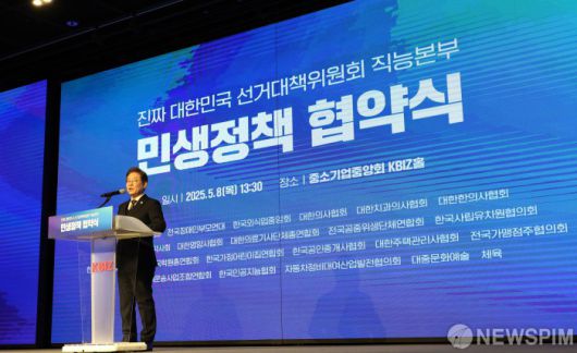 [서울=뉴스핌] 최지환 기자 = 이재명 더불어민주당 대선후보가 8일 오후 서울 영등포구 중소기업중앙회에서 열린 더불어민주당 중앙선거대책위원회 직능본부 민생정책 협약식에서 발언하고 있다. 2025.05.08 choipix16@newspim.com