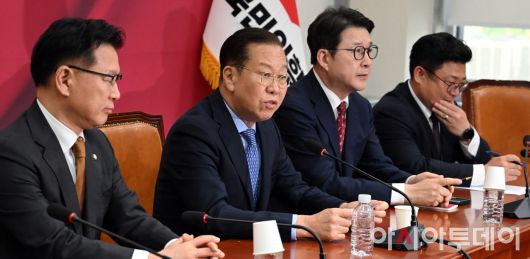 아시아투데이 송의주 기자 = 권영세 국민의힘 비상대책위원장(왼쪽에서 두번째)이 8일 국회에서 대선후보 단일화 관련 기자간담회를 하고 있다. ⓒ "젊은 파워, 모바일 넘버원 아시아투데이"