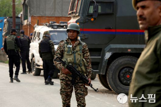 [풀와마 로이터=뉴스핌] 홍우리 특파원 = 7일(현지 시간) 인도 군인들이 인도령 카슈미르 풀와마 우얀의 전투기 추락 사고 현장 근처에서 경비를 서고 있다. 2025.05.07 hongwoori84@newspim.com |