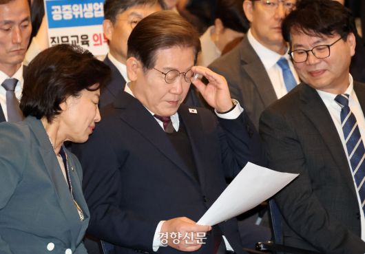 이재명 더불어민주당 대선 후보가 8일 서울 여의도 중소기업중앙회 KBIZ홀에서 열린 중앙선대위 직능본부 민생정책 협약식에서 자료를 보고 있다. 박민규 선임기자 |