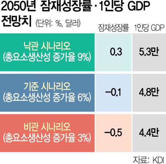 이 같은 우울한 분석은 저출생·고령화 등 인구구조 변화에서 비롯된 측면이 크다. KDI는 “새로운 기술 개발과 습득이 비교적 용이한 청년층 비중의 감소는 경제 전반의 생산성 향상에 부정적 요인”이라고 강조했다. 전체 인구 중 경제활동 참가율이 낮은 고령 인구의 비중이 급증함에 따라 1인당 GDP 증가율도 2040년 중반까지 하락할 것으로 예상됐다.