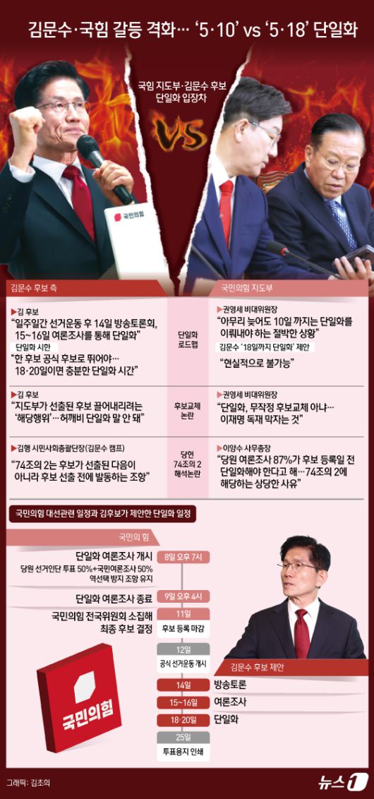 (서울=뉴스1) 김초희 디자이너 = 국민의힘 지도부와 김문수 국민의힘 대선 후보가 단일화를 둘러싸고 연일 강 대 강 충돌하고 있다. 법적 다툼으로까지 번지며 양측의 갈등이 파국으로 치닫고 있다. 김문수 후보는 8일 긴급 기자회견을 열고 당 지도부와 한 후보의 10일까지 단일화 요구를 일축하며, 일주일 더 시간을 갖고 5월18일까지 단일화를 하자고 역제안했다. 동시에 김 후보는 당무우선권을 발동하고 법원에 가처분 신청을 제기해 당의 단일화 일정을 중단시켰다.