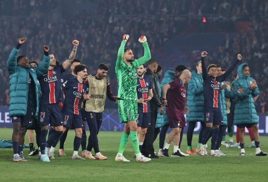 8일(한국시간) 파리 생제르맹 선수들이 유럽축구연맹(EUFA) 챔피언스리그(UCL) 4강 2차전 아스널과의 경기에서 승리한 후 환호하는 모습. |