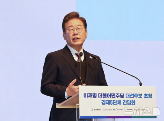 [서울=뉴시스] 국회사진기자단 = 이재명 더불어민주당 대선 후보가 8일 서울 중구 대한상공회의소에서 열린 대선 후보 초청 경제5단체장 간담회에서 발언하고 있다. 2025.05.08. photo@newsis.com |