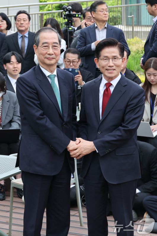 (서울=뉴스1) 안은나 기자 = 김문수 국민의힘 대통령 후보와 한덕수 무소속 대선 예비후보가 8일 오후 서울 여의도 국회 강변서재에서 후보 단일화 관련 회동에 앞서 악수하고 있다. 2025.5.8/뉴스1