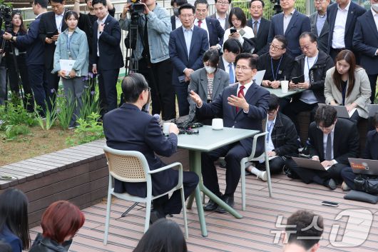 야외에서 공개 만남 갖는 김문수·한덕수