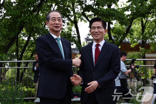 (서울=뉴스1) 김민지 기자 = 김문수 국민의힘 대통령 후보와 한덕수 무소속 대선 예비후보가 8일 오후 서울 여의도 국회 강변서재에서 열린 '후보 단일화' 회동에서 만나 인사를 나누고 있다. 2025.5.8/뉴스1 Copyright ⓒ 뉴스1. All rights reserved. 무단 전재 및 재배포, AI학습 이용 금지.