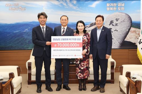 (창원=연합뉴스) 이정훈 기자 = 대한건축사협회, 경남건축사회, 전국 17개 시도건축사회가 8일 경남도를 찾아 박완수 지사에게 산불 피해 주민 돕기 성금 7천만원을 기탁했다.