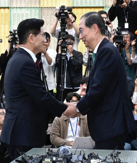 [서울=뉴스핌] 최지환 기자 =김문수 국민의힘 대선후보와 한덕수 무소속 예비후보가 8일 오후 여의도 국회 사랑재에서 단일화 관련 회동을 하고 있다. 2025.05.08 choipix16@newspim.com