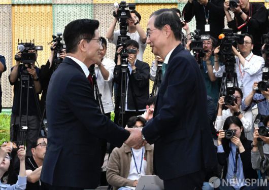 [서울=뉴스핌] 최지환 기자 =김문수 국민의힘 대선후보와 한덕수 무소속 예비후보가 8일 오후 여의도 국회 사랑재에서 단일화 관련 회동을 하고 있다. 2025.05.08 choipix16@newspim.com
