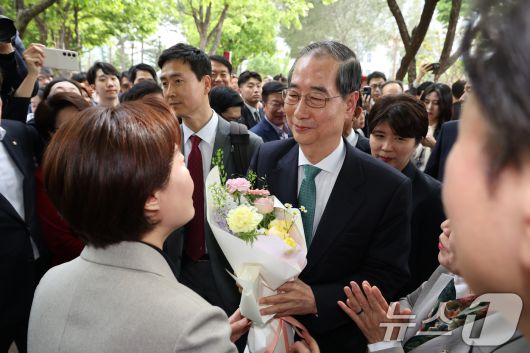 (서울=뉴스1) 안은나 기자 = 한덕수 무소속 대선 예비후보가 8일 김문수 국민의힘 대통령 후보와의 단일화 회동을 위해 서울 여의도 국회 강변서재로 향하다 꽃다발을 받고 있다. (공동취재) 2025.5.8/뉴스1 Copyright ⓒ 뉴스1. All rights reserved. 무단 전재 및 재배포, AI학습 이용 금지.