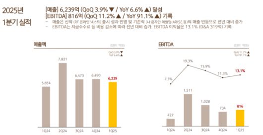 1분기 매출액은 전 분기 대비 3.9% 감소, 전년 동기 대비 6.6% 증가한 6,239억 원을 기록했다. EBITDA는 전 분기 대비 11.2%, 전년 동기 대비 91.1% 증가한 816억 원이고, 마진율은 13.1%이다. 도 CFO는 "지급 수수료 등 비용 구조 개선의 효과가 반영된 결과"라고 설명했다.