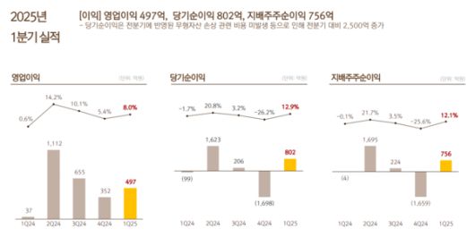 영업이익과 순이익도 뚜렷하게 개선됐다. 도 CFO는 "1분기 영업이익은 497억 원, 당기순이익은 802억 원이다. 지배주주 순이익은 756억 원"이라고 밝히며 "순이익은 지난해 4분기에 반영됐던 무형자산 손상 비용이 사라지고, 지분법 이익이 증가한 영향이 컸다"고 말했다.