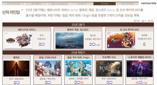 넷마블은 오는 15일 '세븐나이츠 리버스'를 시작으로 '왕좌의 게임: 킹스로드' 글로벌 출시'와 '킹 오브 파이터 AFK'를 출시할 예정이다. 하반기에는 '일곱 개의 대죄: Origin'과 '몬길: STAR DIVE', '프로젝트 SOL' 등 5개의 신작을 앞두고 있다. 올해에만 총 8개 신작이 나온다.