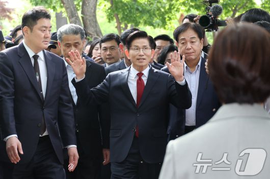 (서울=뉴스1) 안은나 기자 = 김문수 국민의힘 대통령 후보가 8일 오후 서울 여의도 국회 강변서재에서 한덕수 무소속 대선 예비후보와 후보 단일화 관련 공개 회동을 하기 위해 입장하며 인사하고 있다. 2025.5.8/뉴스1coinlocker@news1.krCopyright ⓒ 뉴스1. All rights reserved. 무단 전재 및 재배포, AI학습 이용 금지.