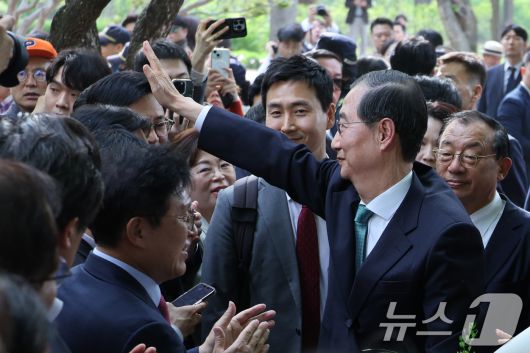 (서울=뉴스1) 안은나 기자 = 한덕수 무소속 대선 예비후보가 8일 오후 서울 여의도 국회 강변서재에서 김문수 국민의힘 대통령 후보와 후보 단일화 관련 공개 회동을 하기 위해 입장하며 지지자들에게 인사하고 있다. 2025.5.8/뉴스1coinlocker@news1.krCopyright ⓒ 뉴스1. All rights reserved. 무단 전재 및 재배포, AI학습 이용 금지.