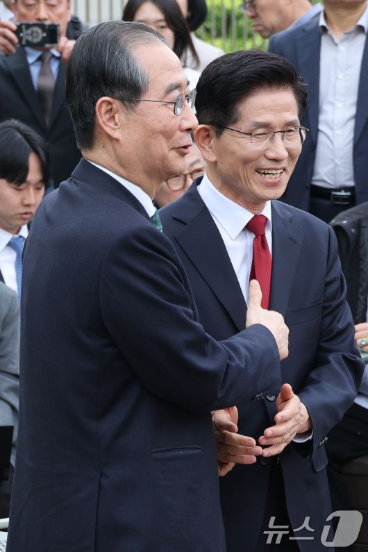 (서울=뉴스1) 안은나 기자 = 김문수 국민의힘 대통령 후보와 한덕수 무소속 대선 예비후보가 8일 오후 서울 여의도 국회 강변서재에서 후보 단일화 관련 공개 회동을 하고 있다. 2025.5.8/뉴스1