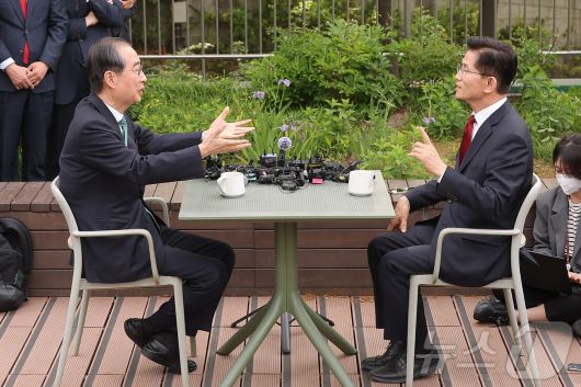 (서울=뉴스1) 안은나 기자 = 김문수 국민의힘 대통령 후보와 한덕수 무소속 대선 예비후보가 8일 서울 국회 사랑재에 위치한 커피숍에서 후보 단일화 관련 회동을 하고 있다. (공동취재) 2025.5.8/뉴스1
