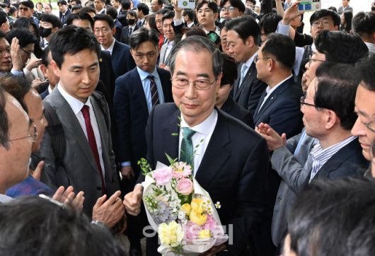 [이데일리 방인권 기자] 한덕수 무소속 대선 예비후보가 김문수 국민의힘 대선 후보와의 단일화를 위한 2차 회동을 하기 위해 8일 국회 사랑재로 향하며 지지자들로부터 꽃다발을 전달받고 있다.