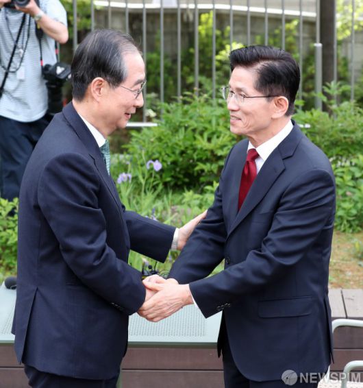 [서울=뉴스핌] 최지환 기자 = 김문수 국민의힘 대선후보와 한덕수 무소속 예비후보가 8일 오후 여의도 국회 사랑재에서 단일화 관련 회동에 앞서 인사를 나누고 있다. 2025.05.08 choipix16@newspim.com |