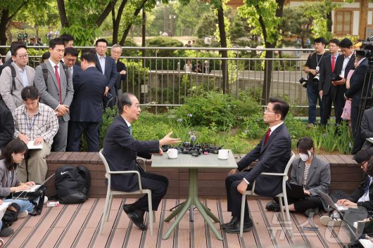 (서울=뉴스1) 안은나 기자 = 김문수 국민의힘 대통령 후보와 한덕수 무소속 대선 예비후보가 8일 서울 국회 사랑재에 위치한 커피숍에서 후보 단일화 관련 회동을 하고 있다. (공동취재) 2025.5.8/뉴스1