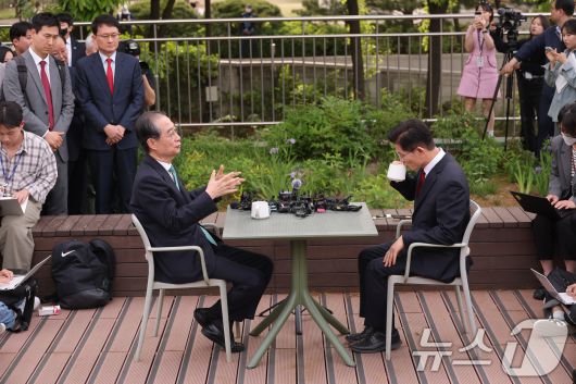 (서울=뉴스1) 안은나 기자 = 김문수 국민의힘 대통령 후보와 한덕수 무소속 대선 예비후보가 8일 오후 서울 여의도 국회 강변서재에서 '후보 단일화' 회동을 하고 있다.(공동취재) 2025.5.8/뉴스1 Copyright ⓒ 뉴스1. All rights reserved. 무단 전재 및 재배포, AI학습 이용 금지.