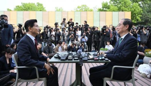 김문수 국민의힘 대선 후보와 한덕수 무소속 대선 예비후보가 8일 국회 강변서재에서 후보 단일화 관련 회동을 하고 있다.