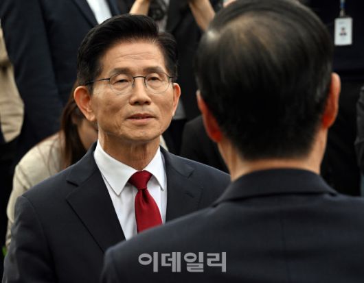 [이데일리 방인권 기자] 김문수 국민의힘 대통령 후보가 8일 오후 서울 여의도 국회 강변서재에서 한덕수 무소속 대선 예비후보와 만나 후보 단일화 관련 논의를 하고 있다.
