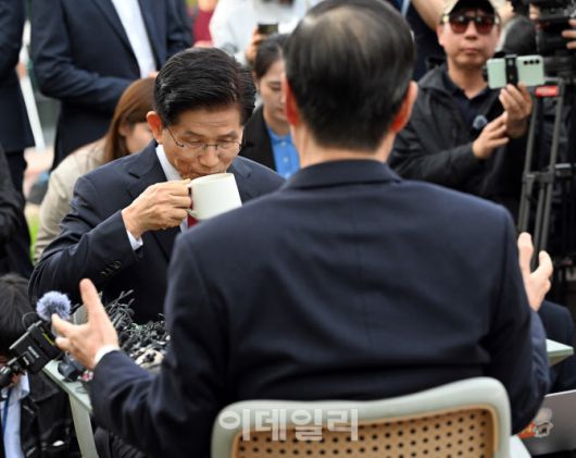 [이데일리 방인권 기자] 김문수 국민의힘 대통령 후보가 8일 오후 서울 여의도 국회 강변서재에서 한덕수 무소속 대선 예비후보와 만나 후보 단일화 관련 논의를 하고 있다.