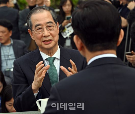 [이데일리 방인권 기자] 한덕수 무소속 대선 예비후보가 8일 오후 서울 여의도 국회 강변서재에서 김문수 국민의힘 대통령 후보와 만나 후보 단일화 관련 논의를 하고 있다.