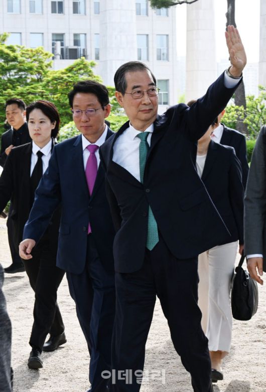 [이데일리 방인권 기자] 한덕수 무소속 대선 예비후보가 8일 국회 강변서재 앞뜰에서 열린 김문수 국민의힘 대통령 후보와 회동에 참석하며 지지자들에게 손을 들어 인사하고 있다.