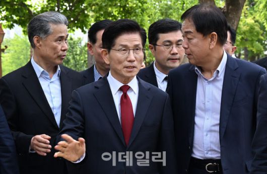 [이데일리 방인권 기자] 김문수 국민의힘 대통령 후보가 8일 국회 강변서재 앞뜰에서 열린 한덕수 무소속 대선 예비후보와 회동에 참석하고 있다.