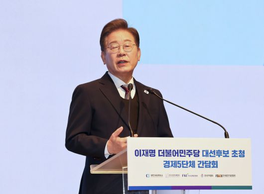 더불어민주당 이재명 대선후보가 8일 서울 중구 대한상공회의소에서 열린 대선후보 초청 경제5단체 간담회에서 인사말을 하고 있다. 국회사진기자단 |